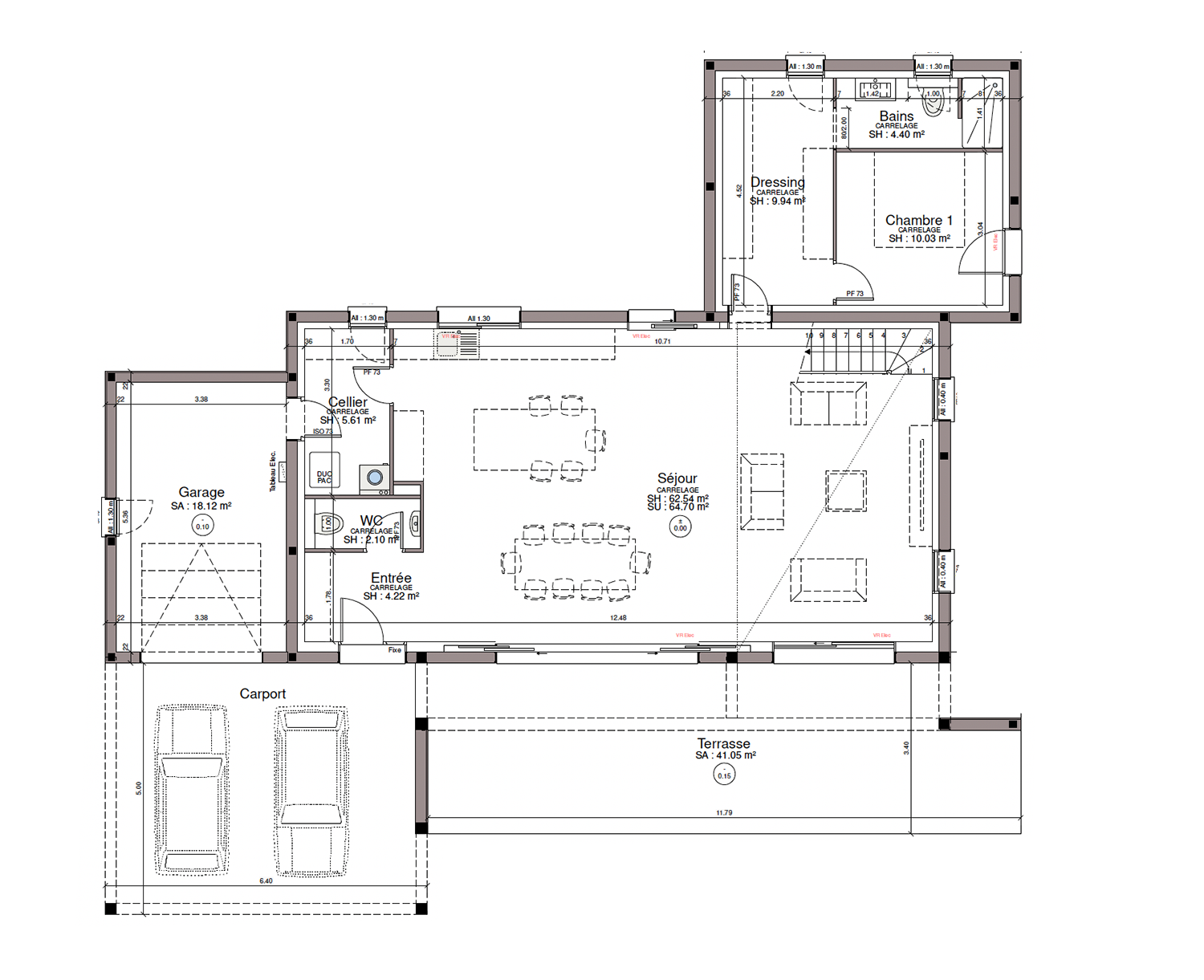 Le modèle AIGUE-MARINE, présenté ici, dispose d'une surface habitable de 149m², d'un RDC avec une sublime suite parentale de 10,03 m² reliant salle de bains et dressing pour une suite complète et optimisée.