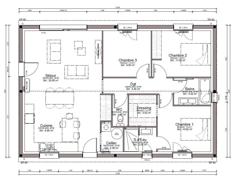 Maison T4 de plain-pied, 90m², 3 chambres dont une suite parentale.
