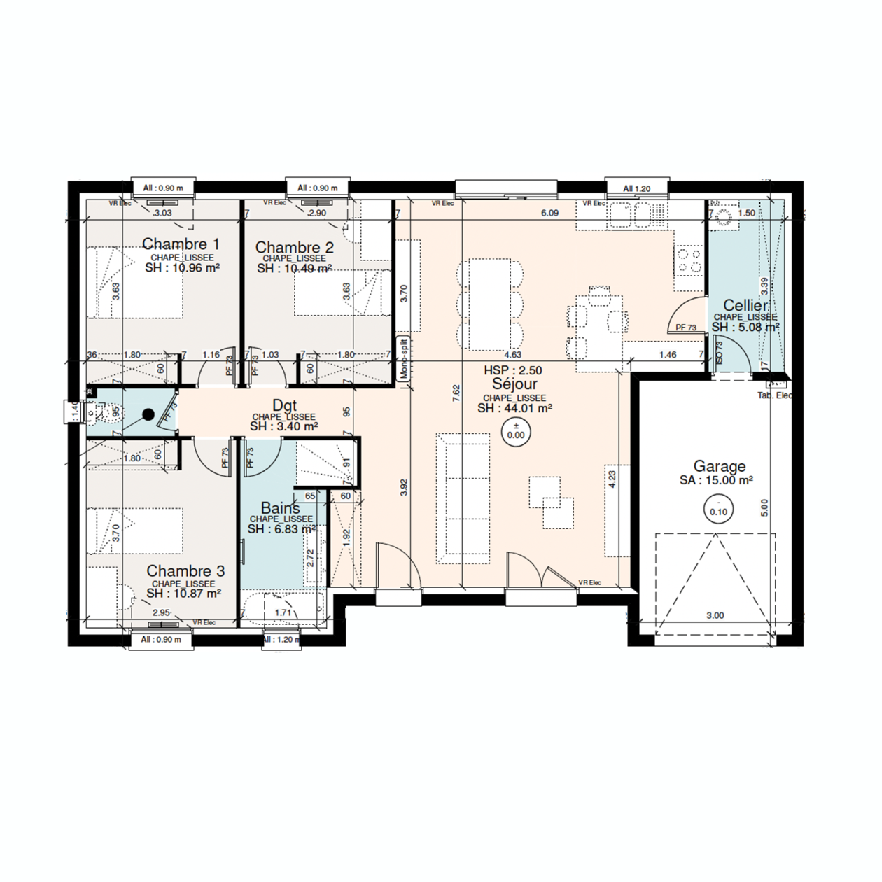 Comme toute création Villas et Maisons de France. ce modèle Andromède, aux lignes caractéristiques de la nouvelle Villa Occitane, est intégralement modulable par notre bureau d'étude interne et spécialisé. Notre version catalogue de 93 m² habitables comprend une partie jour dotée d'une très grande pièce de vie de plus de 44 m², à la luminosité optimale. L'agencement garage, cellier et cuisine ouverte sur le salon est particulièrement ingénieux et fonctionnel. Côté nuit, 3 belles chambres, une salle de bain spacieuse avec baignoire, douche et double vasque, ainsi que des WC séparés forment un ensemble adapté à l'usage.