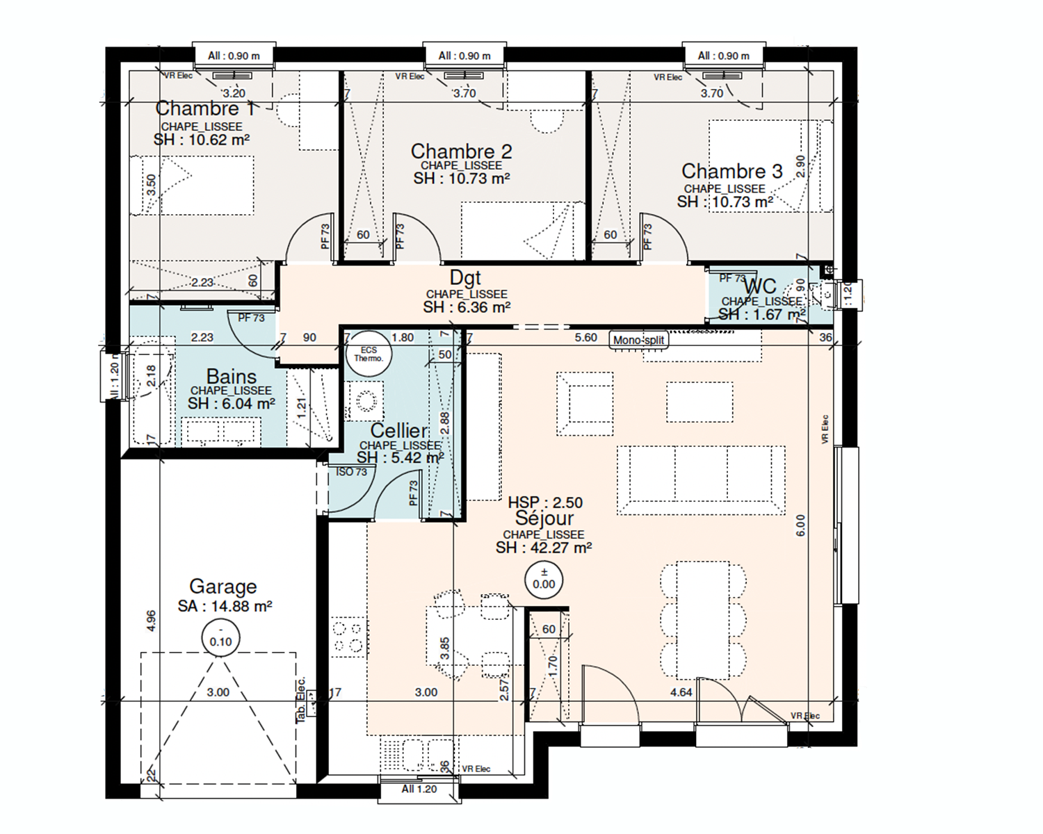 Originalité et élégance sont les maîtres mots pour la version catalogue présentée ici de cette villa nommée « Cassiopée 93 ». Entrée fonctionnelle avec rangements, espace de vie de plus de 42m², vous serez séduits par la praticité du coin cuisine, buanderie et garage intégré. L’espace nuit vous offre 3 belles chambres, une salle de bains et un WC indépendant.
