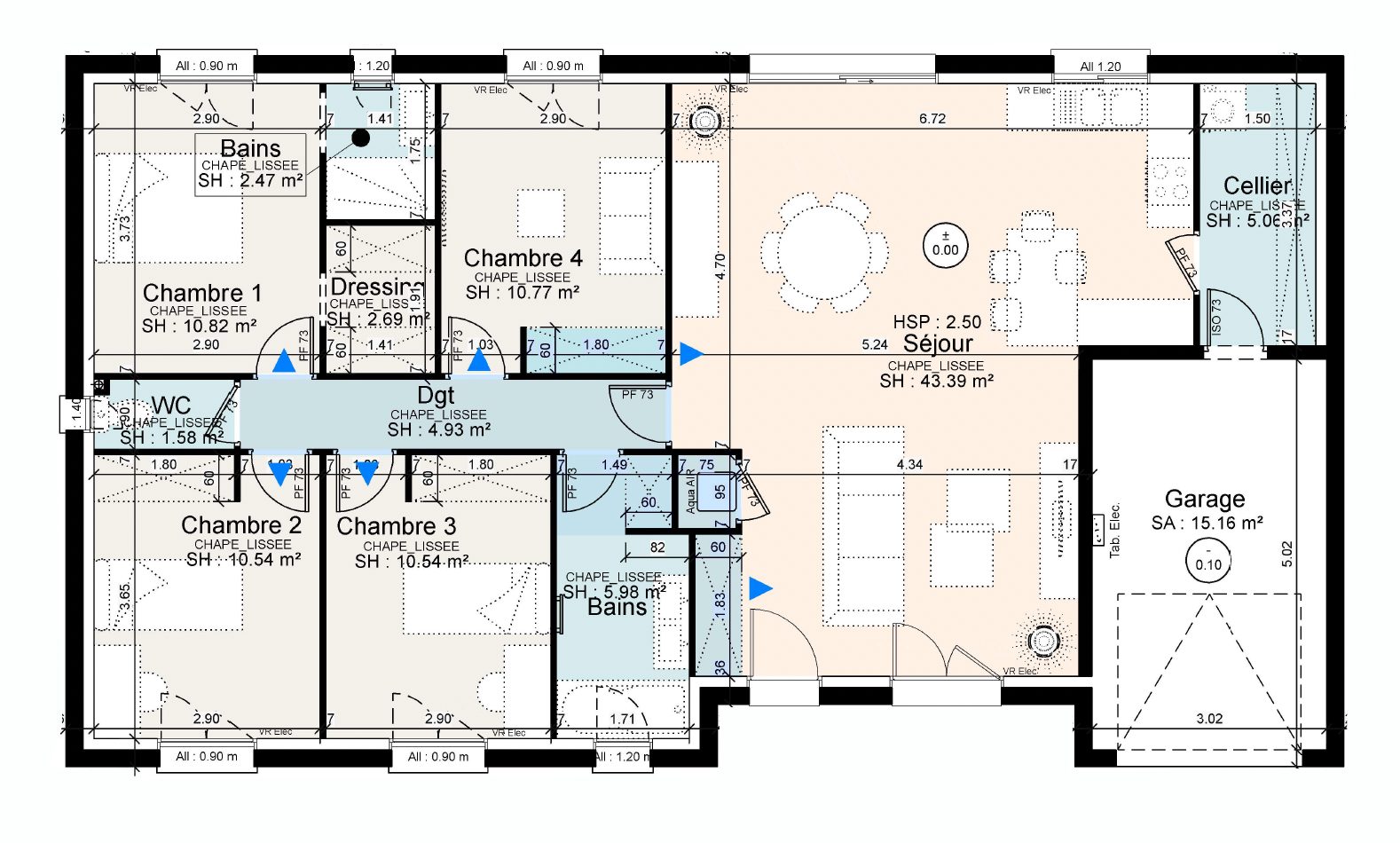 Comme toute création Villas et Maisons de France. ce modèle Andromède, aux lignes caractéristiques de la nouvelle Villa Occitane, est intégralement modulable par notre bureau d'étude interne et spécialisé. Notre version catalogue de 109 m² habitables comprend une partie jour dotée d'une très grande pièce de vie de plus de 43 m², à la luminosité optimale, agrémentée d'une cuisine ouverte avec cellier accolé et accès vers le garage. Côté nuit, le confort est assuré par 4 chambres dont une suite parentale ergonomique, une salle de bain spacieuse et des WC séparés.