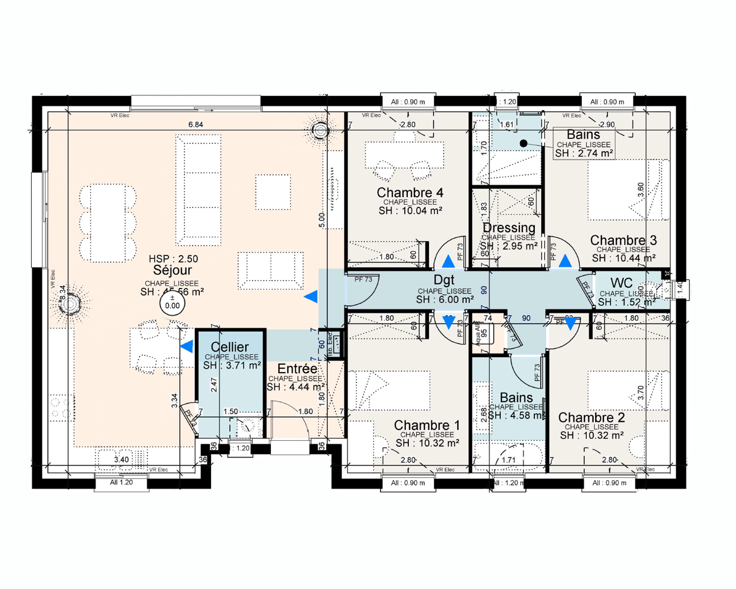 Innovant et actuel, le modèle Andromède proposé ici, de 113 m² habitables, comprend une partie jour dotée d'une grande pièce de vie lumineuse de 45 m², agrémentée d'une cuisine ouverte avec cellier accolé. Côté nuit, le confort est assuré par 4 chambres dont une suite parentale ergonomique, une salle de bain spacieuse et des WC séparés.