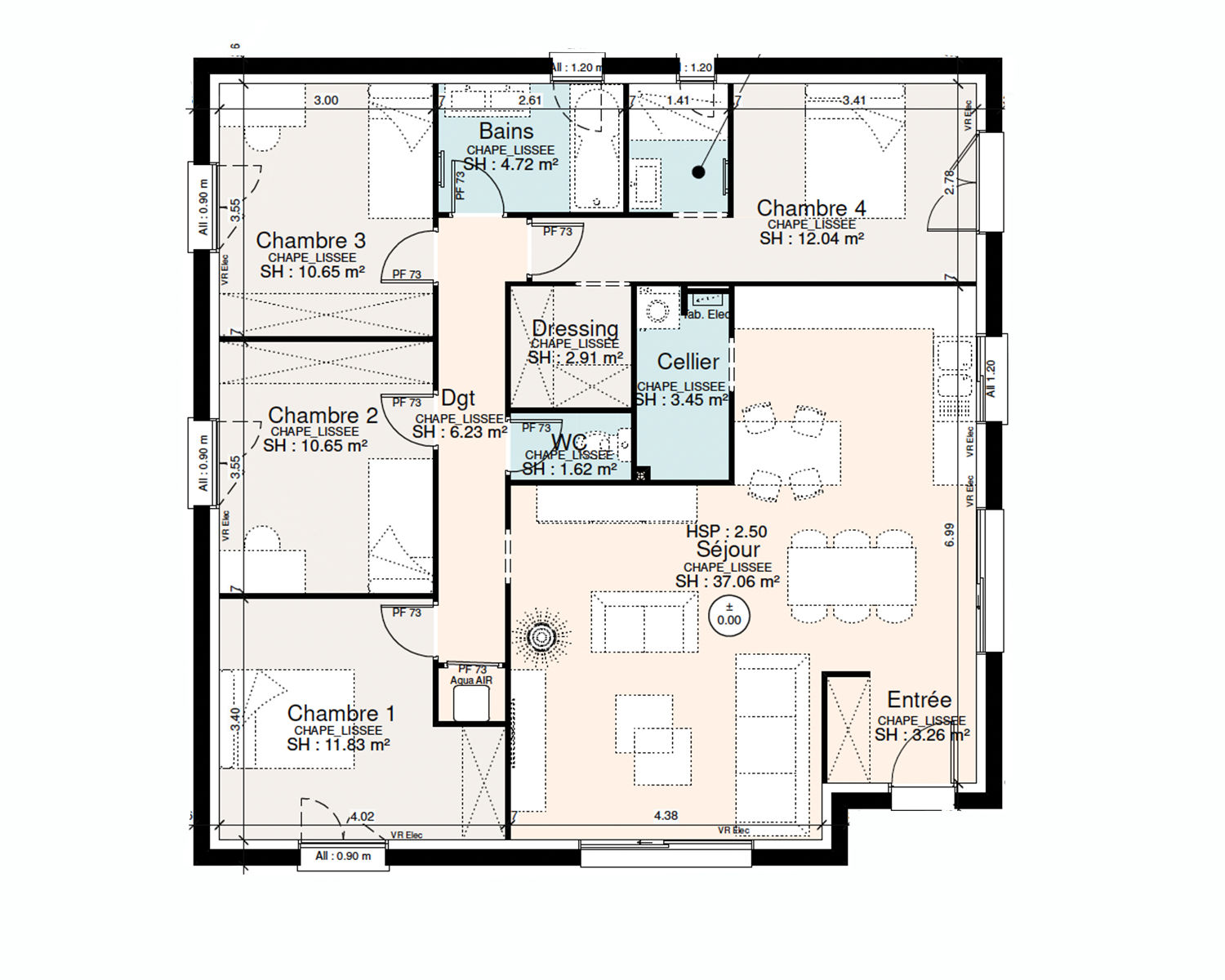 D’un design traditionnel et tendance, mais ajustable à vos goûts, le modèle « Cassiopée 107 » est une villa de 107 m² habitables, baignée de lumière grâce à ses longues baies vitrées. L’espace jour offre 37m² avec coin cellier attenant à la cuisine. 4 belles chambres composent l’espace nuit en respectant l’intimité de la suite parentale.