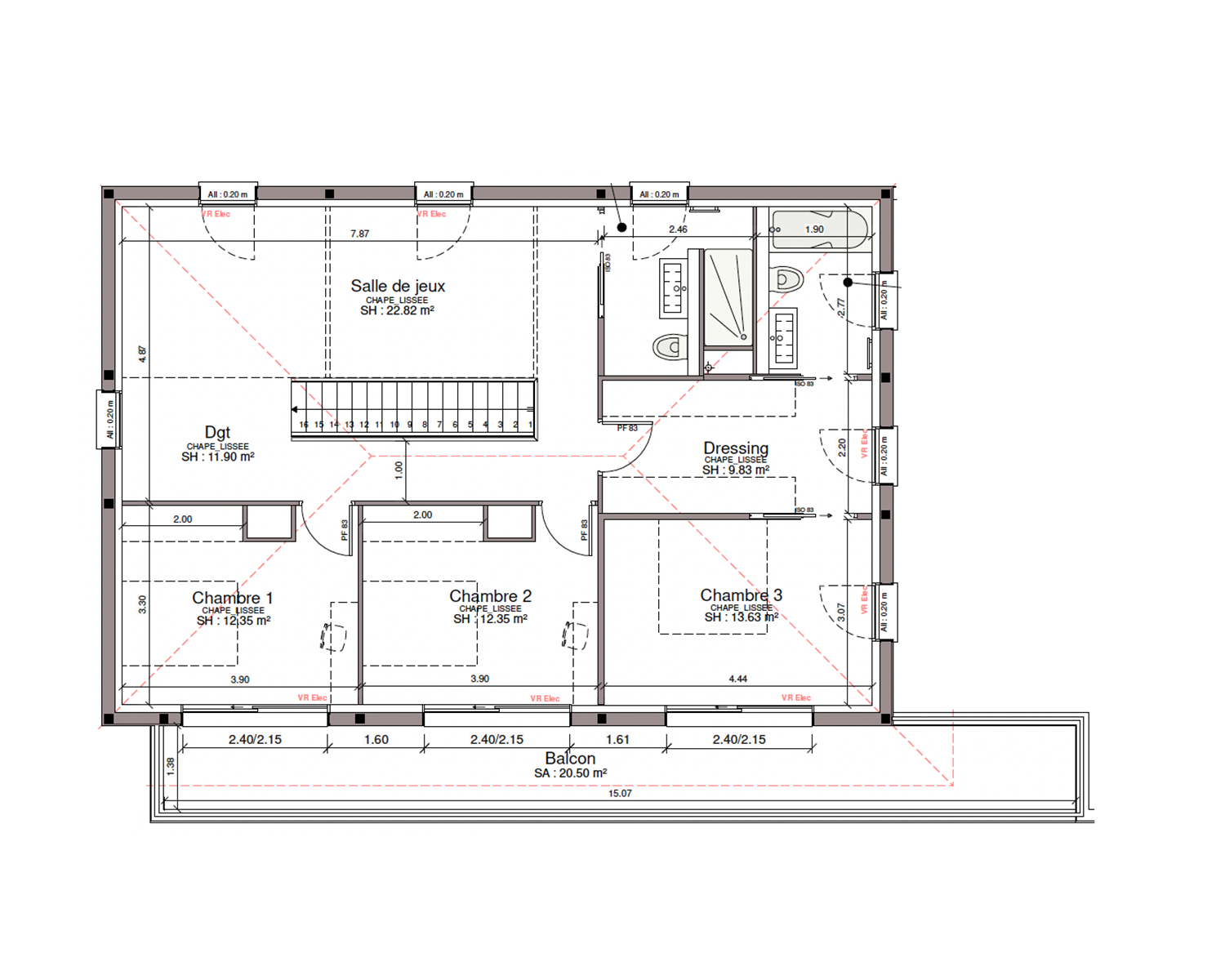 Une salle de jeux aérée de 22,82 m² vient s'ajouter à l'étage pour l'amusement de vos enfants. La pièce à vivre, lumineuse, de près de 60 m², comprend salon et salle à manger.