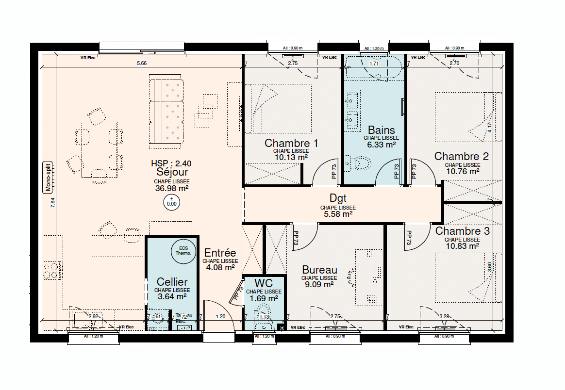 Dans sa version catalogue, ce modèle dispose de 99 m² de surface habitable. Fonctionnel, son aménagement intérieur comprend un coin nuit avec 3 belles chambres de 10 à 11m² avec un bureau de 9m² complétée d'une salle de bain de 6.33 m². La pièce à vivre, lumineuse, de près de 40 m², comprend salon et salle à manger. La cuisine ouverte prolonge ce sentiment de confort et prévoit des rangements significatifs dans le cellier.