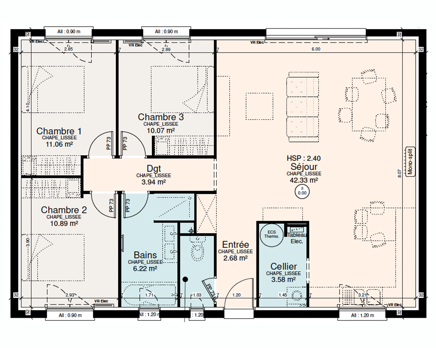 La "FIRST 92" présentée ici, dispose d'une surface habitable de 92 m². Fonctionnel, son aménagement intérieur comprend un coin nuit avec 3 belles chambres entre 11 et 12m² complétées d'une salle de bain de 6.22m². La pièce à vivre, lumineuse, de près de 42m², comprend salon et salle à manger. La cuisine ouverte prolonge ce sentiment de confort et prévoit des rangements significatifs dans le cellier.